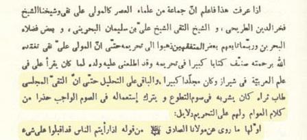 menyebutkan : bahwa at Taqiy al-Majlisi (mujaddid Syiah) mengkonsumsi ganja pada saat puasa sunnah, sedang dalam puasa wajib/Ramadhan meninggalkannya karena takut dicemooh orang awam!