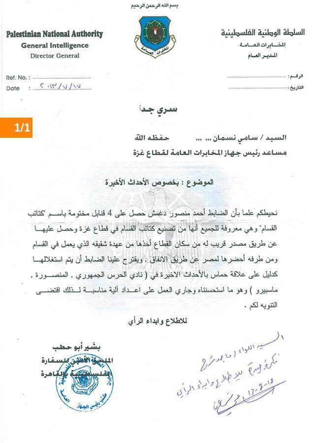 Gensyiah:Hamas membongkar kejahatan para pemimpin kudeta mesir dengan membeberkan bukti bukti. pemerintah palestina di Ramullah membentuk tim khusus untuk mensuplai media massa mesir dengan berita berita dusta guna menjelekkan hamas. Bukti yang paling berbahaya adalah dokumen intelijen palestina berisi pemerintah Ramullah berhasil mendapatkan 4 bom buatan hamas terus dimasukkan ke mesir melalui terowongan dan diusulkan unntuk diledakkan di mesir sehingga hamas tertuduh dalam kasus kasus pembantaian di mesir seperti dai haras al jumhuri, di almanshurah dll. Dan sekarang sedang disiapkan untuk itu. Berikut dokumennya: